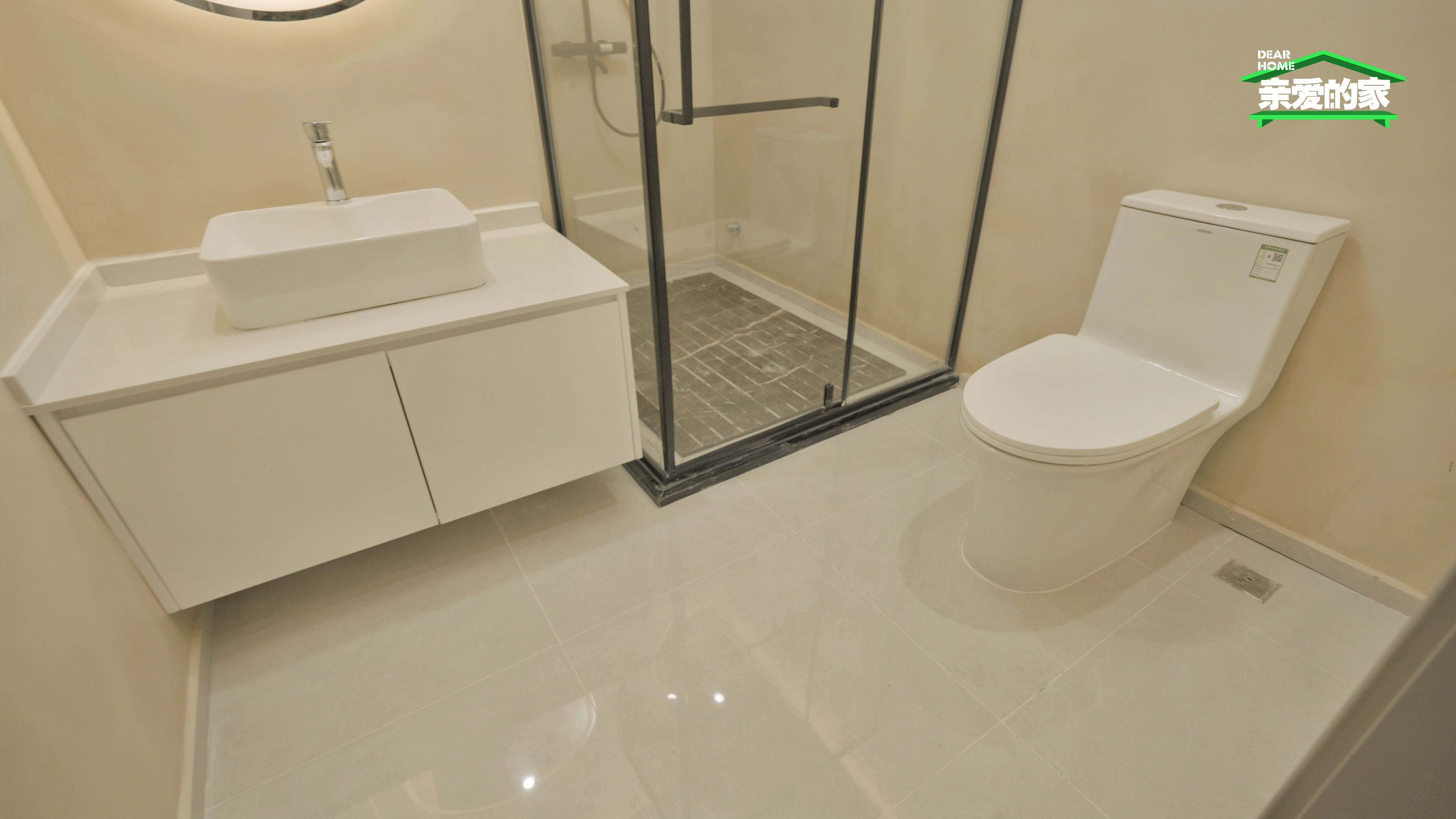 易损耗的卫生空间分别选取了普陀灰和莱茵米黄哑光瓷砖,用品质与温馨打造舒适有质感